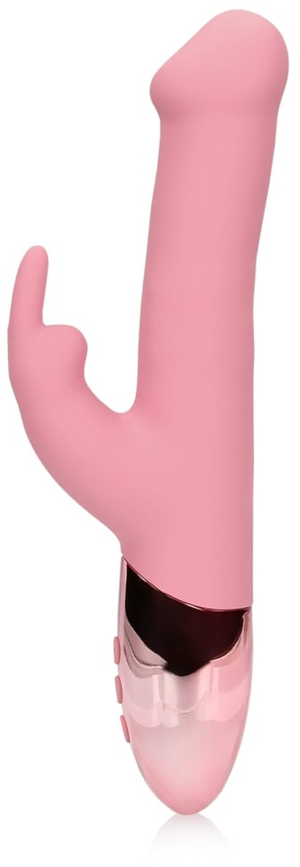 Ярко выраженная головка вибратора точечно воздействует на G-зону, блок металлических шаров в стволе интенсивно ласкают стенки лона при вращении, а клиторальный стимулятор в виде зайки с ушками значительно увеличивает накал страсти, работая снаружи!